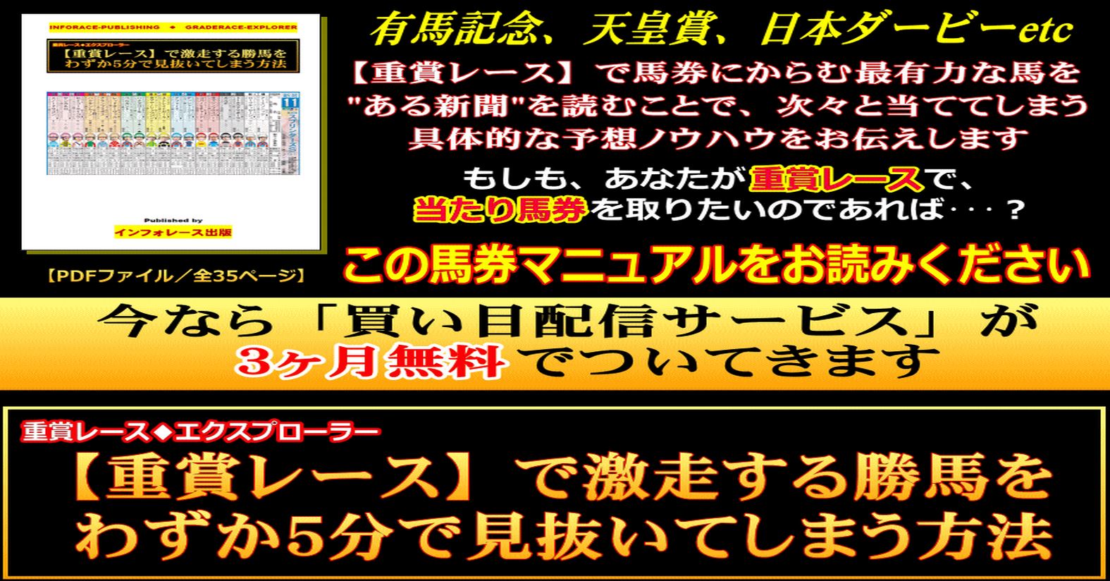 「重賞レース◆エクスプローラー」は、マニュアル片手に、日刊スポーツ新聞の出馬表を見るだけで、簡単に重賞レースで好走が予想される有力馬を選び出すことができる馬券術です。