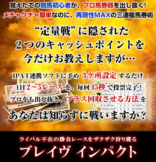 「ブレイヴインパクト」はワイド・三連複のみで、当り馬券を狙いにいく馬券購入ソフトです。