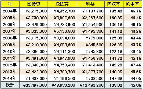 2004年以降、毎年140%前後の回収率と45%前後の的中率を実現しています。