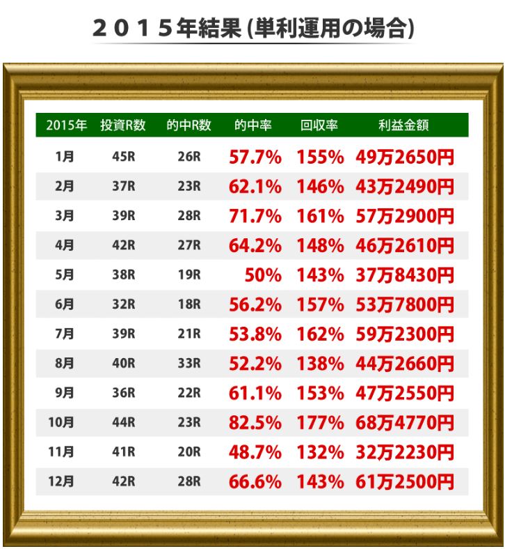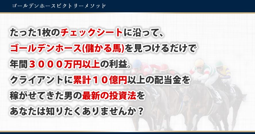 「ゴールデンホースビクトリーメソッド」でお伝えしている投資法を習得すれば、的中率70%・回収率150%・年間利益総額3,000万円以上を可能にできます。