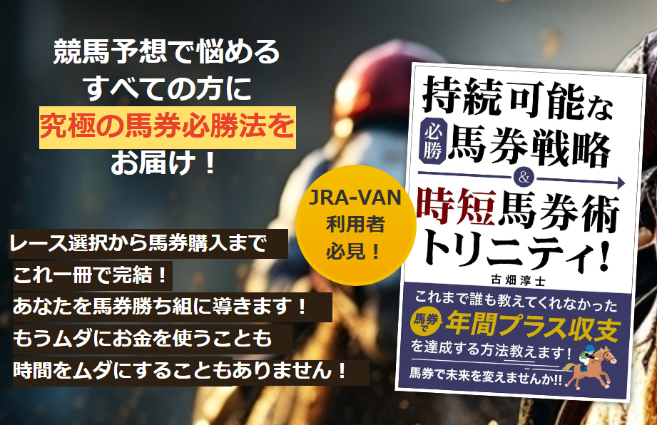 JRA-VANアプリもしくはJRA-VANネクストに登録することが大前提ですが(お試し1ヶ月無料登録できます)、当書籍PDF約250ページを読み終えたらその週末からすぐにでも『時短馬券術トリニティ!』が実戦可能となります。