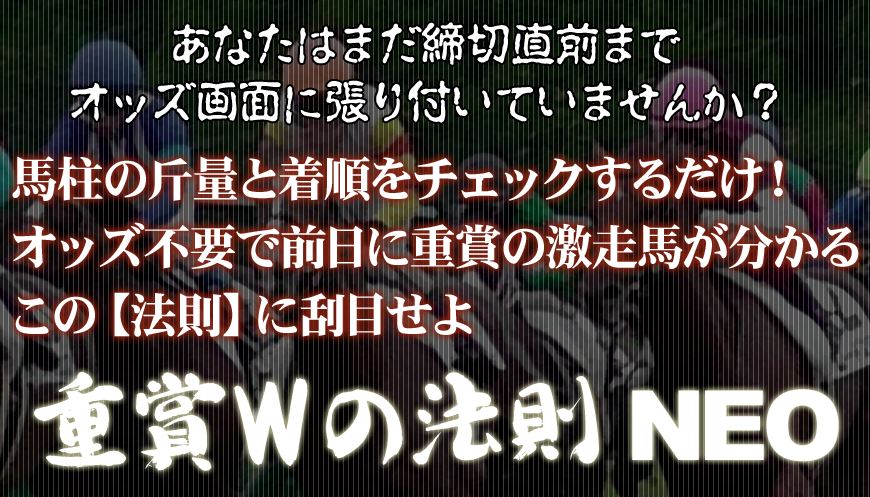 オッズ不要で前日に重賞の激走馬が分かるという【法則】…それがこの『重賞Wの法則 NEO』です。