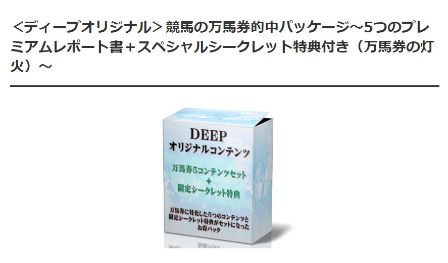 「競馬の万馬券的中パッケージ」とは、“5つのプレミアムレポート書”と“スペシャルシークレット特典付き(万馬券の灯火)”がセットになっている万馬券特化パッケージです。